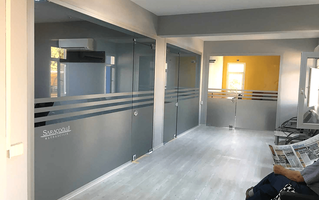 Düz buzlu cam görünümü yapıldığı gibi desenli kumlama ,özel tasarım kumlama veya renkli uygulamalar da yapılabilir.